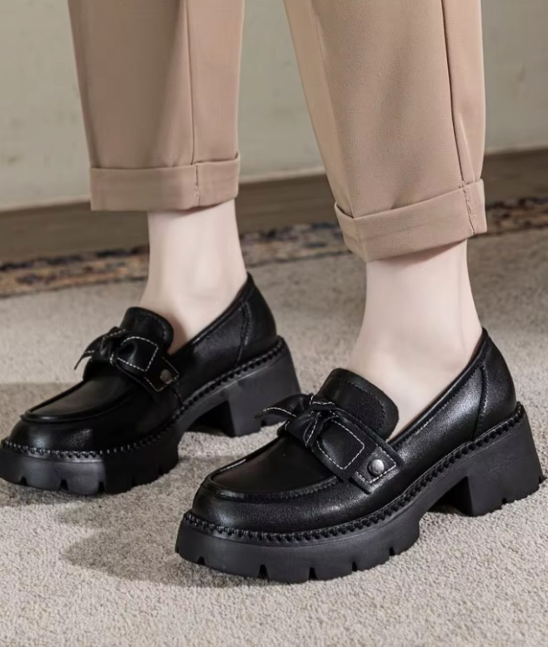 Offre-toi un style rétro irrésistible avec ces chaussures à plateforme noires ornées d'un délicat noeud papillon en cuir véritable. Leur couleur intemporelle et leur design élancé rehaussent ton look tout en affinant tes jambes et te surélevant de 5 centimètres ! Conçus en cuir véritable, ces mocassins offrent un confort exceptionnel, que ce soit pour les enfiler ou marcher toute la journée. Leur coupe basse sous la cheville te permet de les porter sans chaussettes au printemps ou avec de petites socquettes en hiver.
