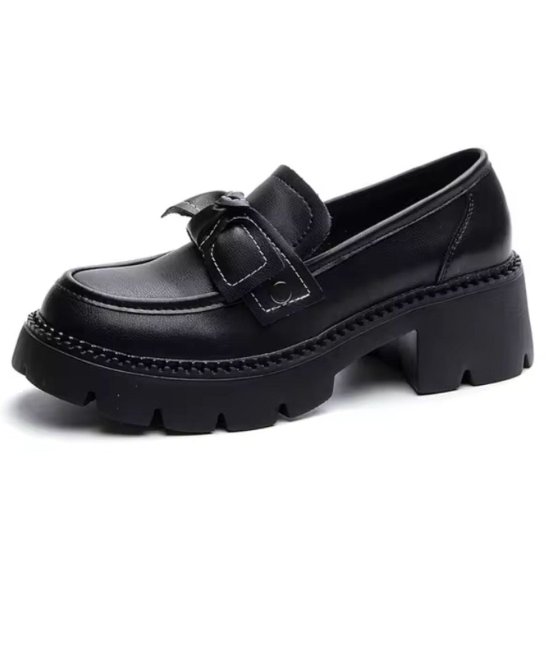 Une paire de mocassins à plateforme ornés d'un nœud papillon noir, idéale pour compléter ta garde-robe avec style et élégance.