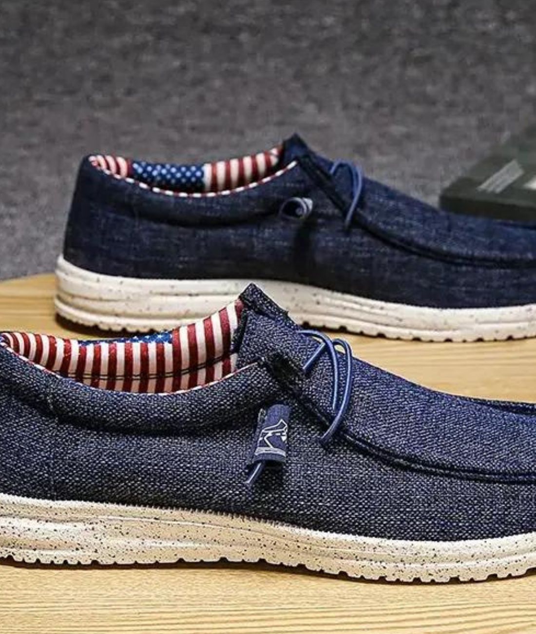 Offre-toi un look unique et intemporel avec ces mocassins au style denim en bleu marine pour homme ! Parfaits pour compléter une tenue printanière, estivale, automnale, voire même hivernale par temps clément. Leur forme de mocassin bateau emblématique leur confère une élégance supplémentaire. Fabriqués en toile de coton au denim bleu foncé, ces mocassins pour hommes se distinguent par leur polyvalence et leur style urbain décontracté. L'intérieur de la chaussure, orné de stries blanches et rouges, assure un confort optimal pour la voûte plantaire et la cheville.