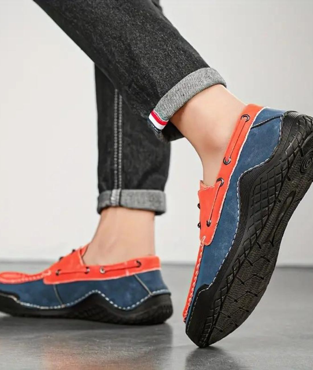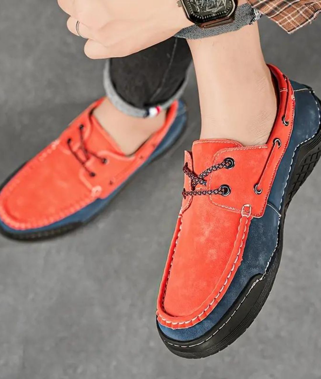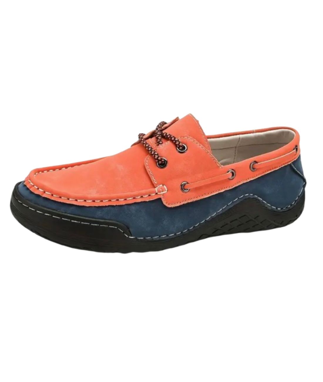 Pour les hommes actifs à la recherche de chaussures à la fois pratiques et stylées au quotidien, ces mocassins tricolores sont un choix incontournable. Que ce soit pour le travail ou les longues promenades, ce modèle alliant l'orange et le bleu marine, rehaussé d'un lacet de maintien, offre une polyvalence exceptionnelle pour toutes tes activités quotidiennes. Les coutures soignées et le cordon le long de la chaussure rappellent avec élégance le style bateau décontracté, parfait pour une allure moderne et décontractée.