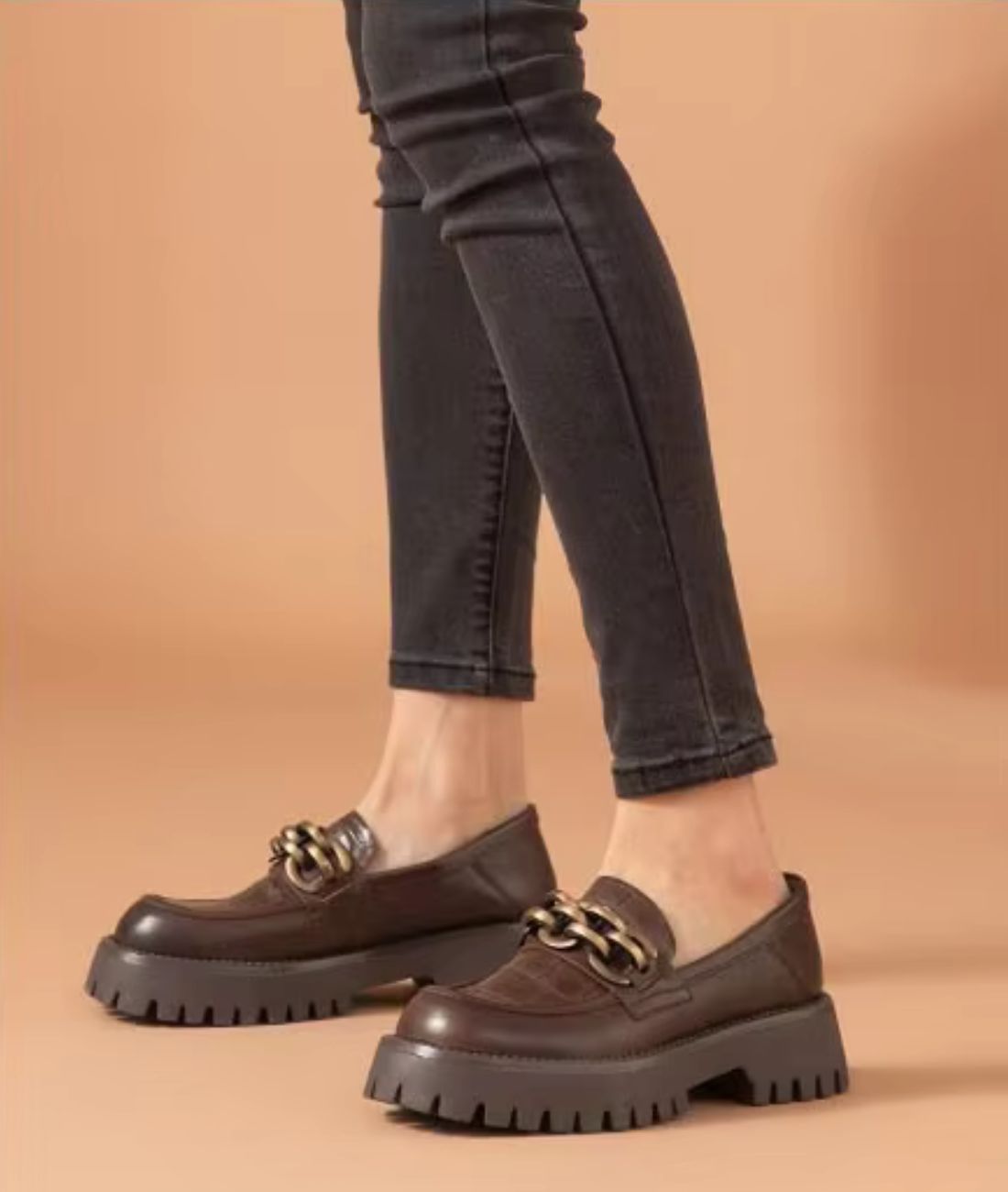 Offre-toi l'élégance ultime avec ces mocassins au design raffiné et sophistiqué. Leur couleur marron café associée à une chaîne en métal doré apporte une touche de glamour à toutes tes tenues. Parfaits pour un look chic et tendance en toute saison.