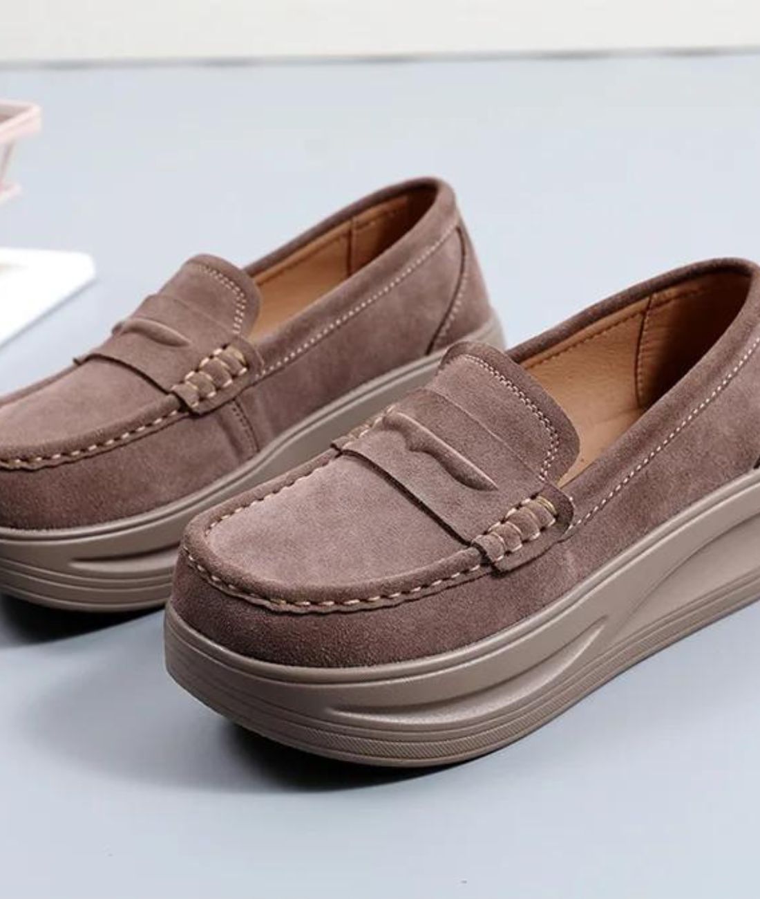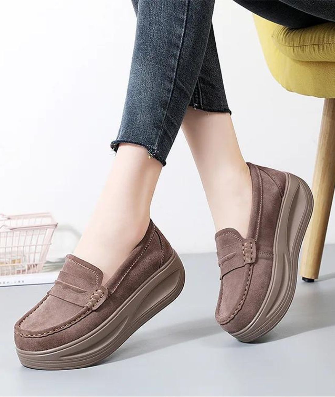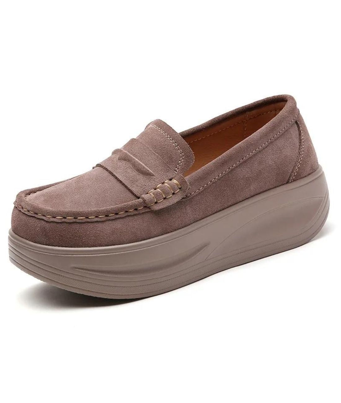 Offre-toi le luxe de la texture soyeuse et du style raffiné de ces mocassins compensés en daim véritable ! Conçue pour la femme moderne, cette paire de mocassins en cuir suédé allie élégance et glamour avec sa teinte brun rosé subtile. Son bout arrondi emblématique et sa semelle compensée de 5 cm en font un choix chic et confortable pour toutes les occasions.