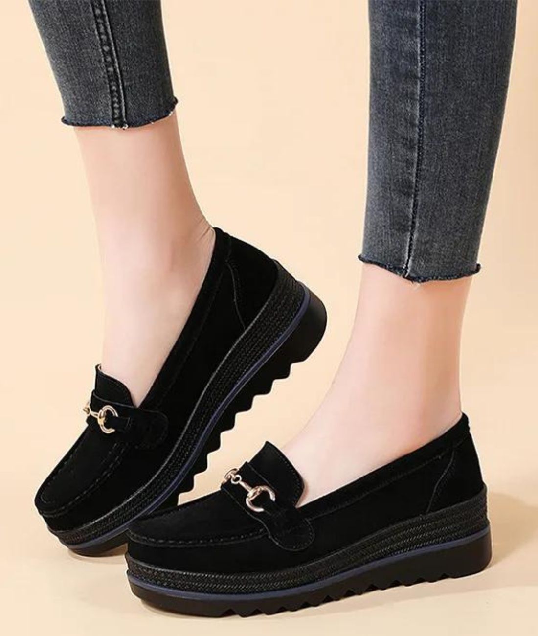 Découvre ces Mocassins Compensés avec Détails de Boucles Dorées pour Femme
