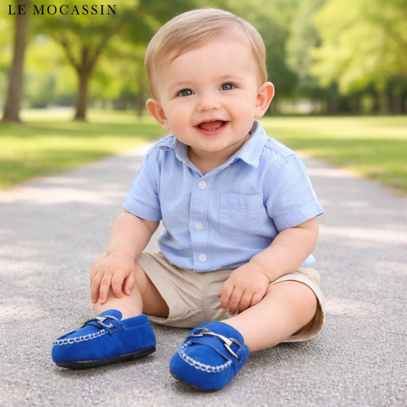 Découvre ces adorables mocassins pour bébé garçon en suédine avec mors argentés !
