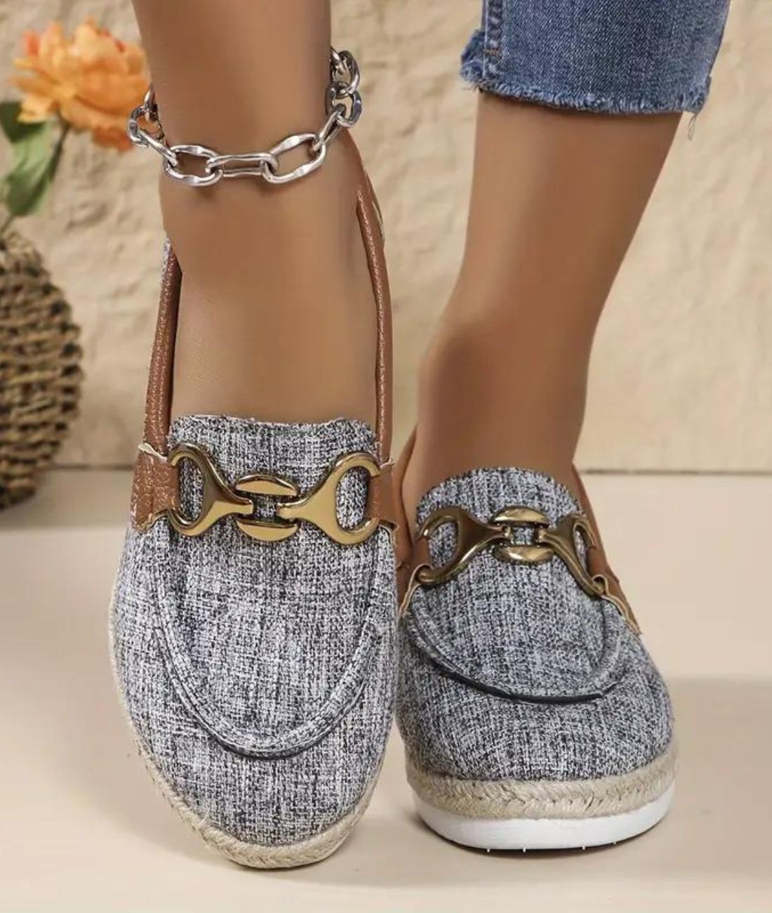 Offre-toi une touche de modernité et de vintage avec ces mocassins en jean gris clair pour femme. Parfaits pour sublimer tes tenues, ces chaussures allient élégance et originalité, mettant en valeur ta féminité. La combinaison de la toile de jean, du simili cuir marron et du mousqueton en métal doré confère à ces mocassins un style unique qui ne passera pas inaperçu.