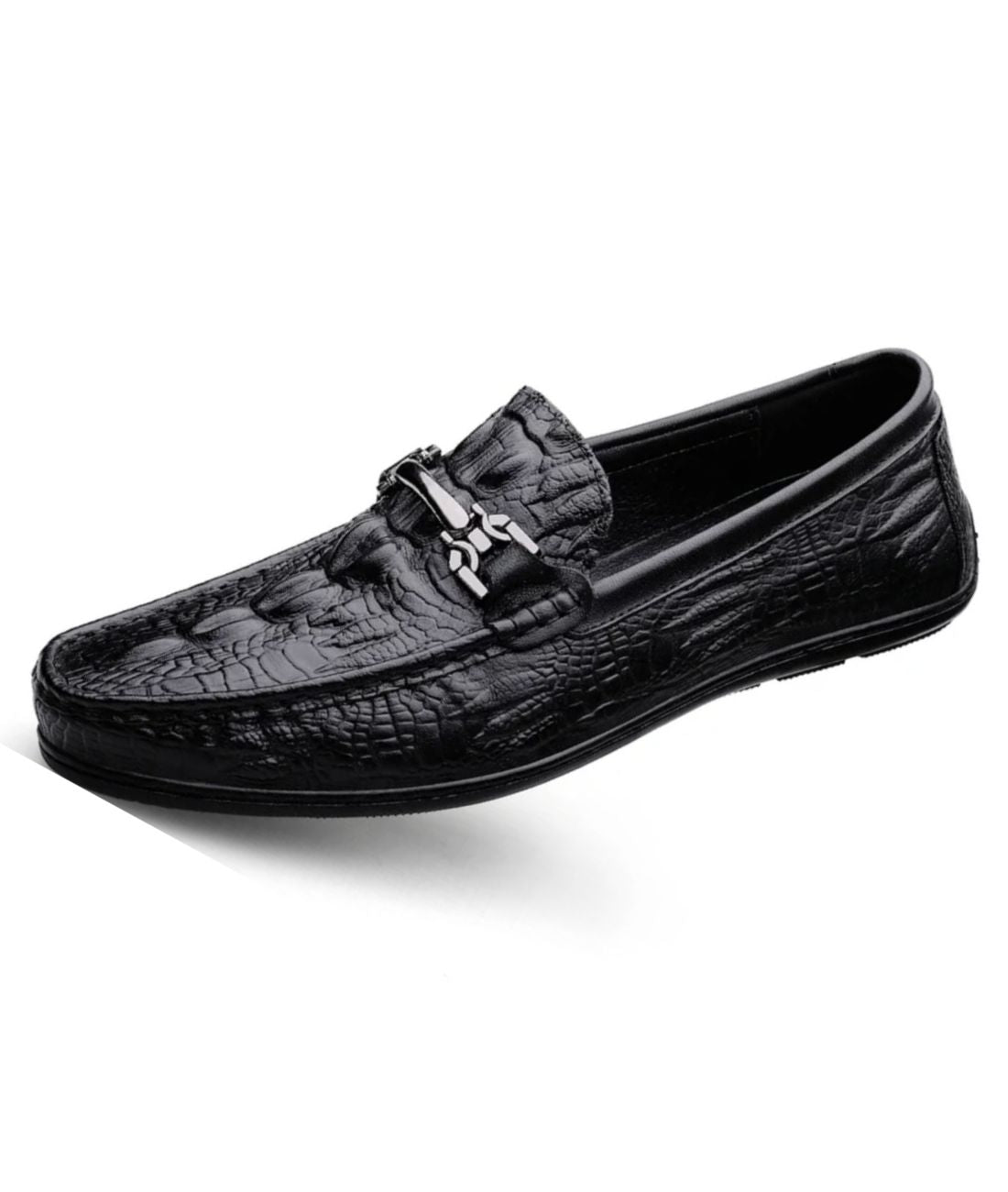 Opte pour le luxe et l'élégance du cuir serpent avec ces mocassins noirs au look bateau. Parfaits pour les hommes qui aiment allier décontraction et classe, ces chaussures de ville polyvalentes sauront mettre en valeur ton style avec leur simili cuir ultra réaliste. Assure-toi de choisir la bonne pointure pour un confort optimal. Les détails en fer argenté et les motifs d'écailles de serpent embossés ajoutent une touche unique à ces mocassins.