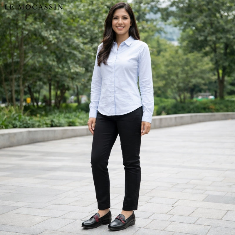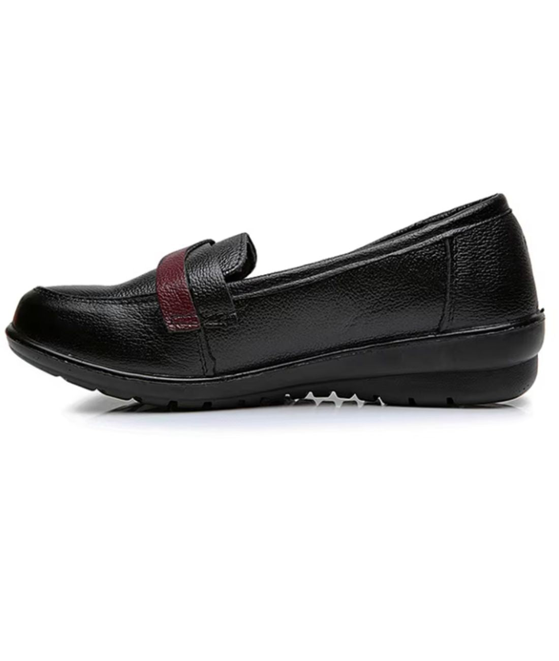 Les mocassins à talon compensé pour femme sont un incontournable du dressing féminin contemporain, revisités ici dans un style ballerine. Confectionnés en cuir véritable, ce modèle bicolore noir et rouge bordeaux apporte une touche subtile et vive à ta tenue. Le bout rond assure un confort optimal au quotidien, tandis que le cuir souple garantit une respirabilité agréable, parfait pour toutes les saisons.