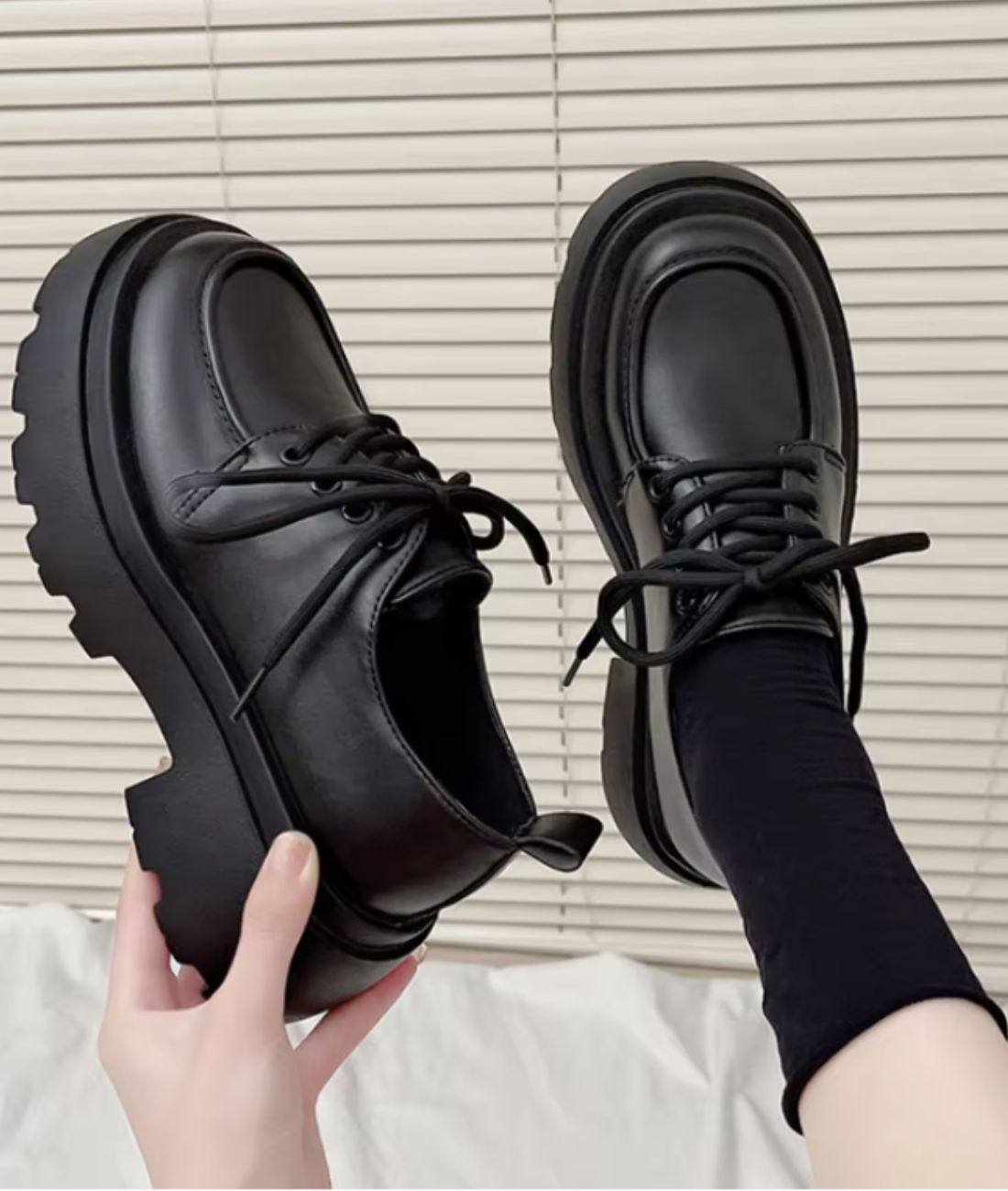 Ta commande comprend une paire de mocassins à plateforme en cuir synthétique noir de taille 35, emballée avec soin pour une réception parfaite.