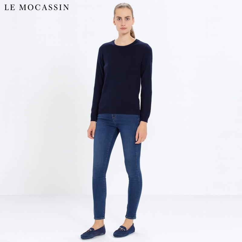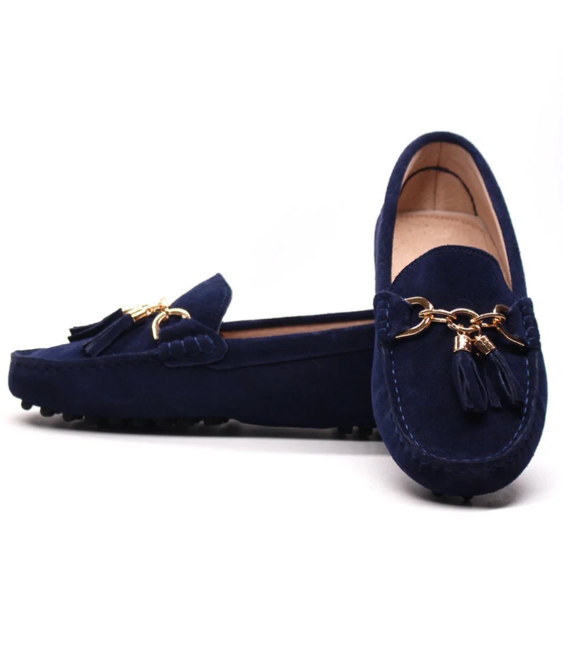Plonge dans l'élégance avec notre paire de mocassins en daim bleu marine pour femmes, alliant subtilement classe et féminité. La couleur bleu marine apporte une touche de distinction à ton style, que ce soit en journée ou en soirée. Ces loafers ornés de pampilles en daim et de boucles en métal doré offrent un look raffiné. Les détails tels que les coutures visibles et les surpiqûres blanches soulignent l'authenticité de ce mocassin au design bateau.