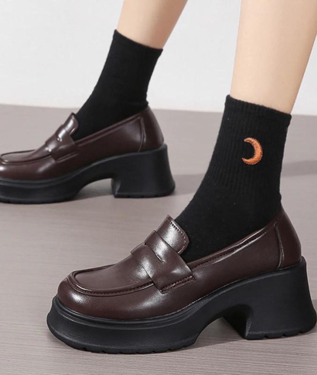 Avec leur design rétro très tendance, ces mocassins marrons à plateforme s'accordent parfaitement avec l'ensemble de ta garde-robe féminine. Conçus dans un matériau respirant et lisse, ils sont suffisamment souples pour épouser la forme de tes pieds. La sublime couleur marron café confère à ces chaussures une allure urbaine et intemporelle, parfaite pour ta tenue du jour !